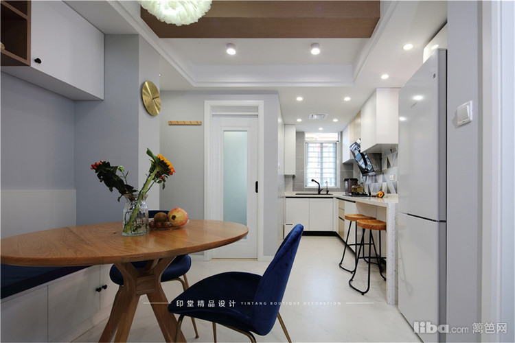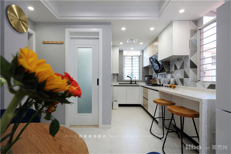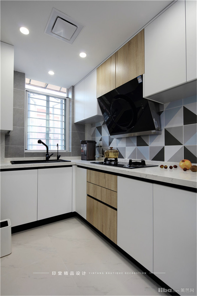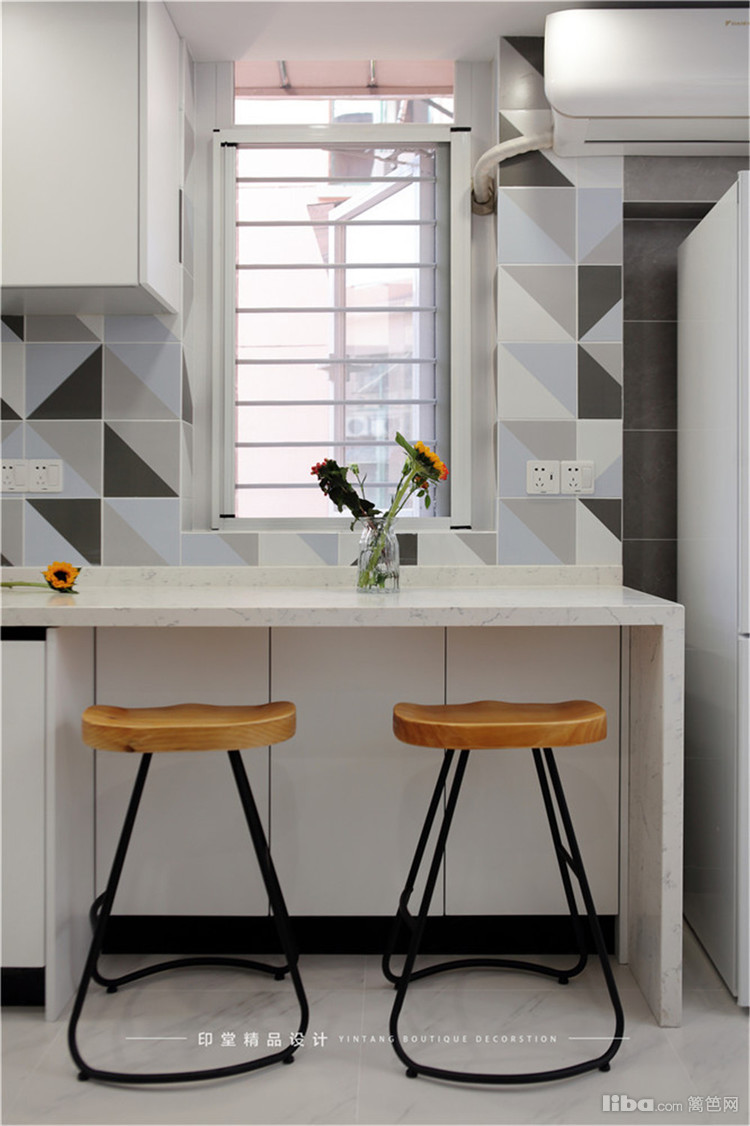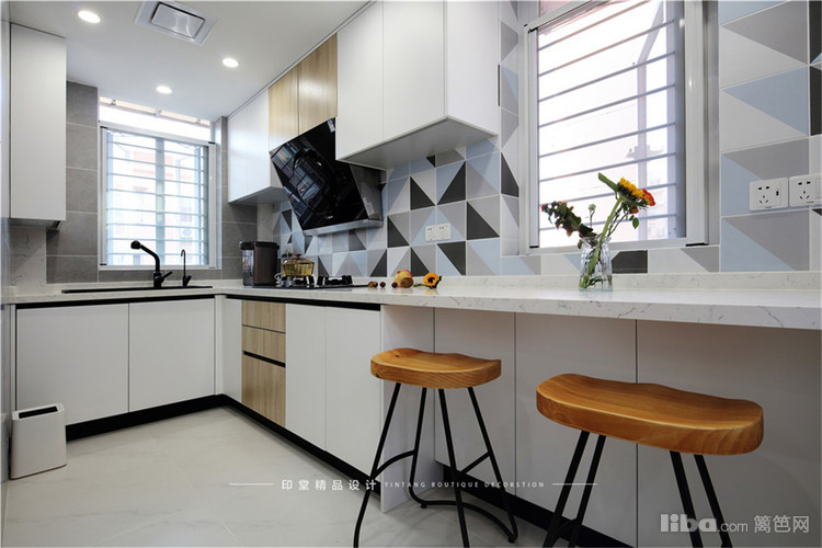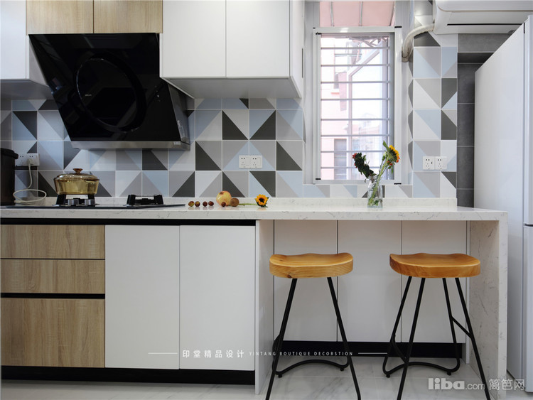 厨房是开放式的,运用了几何砖。整体橱柜门板的选择上使用了白色+原木色。