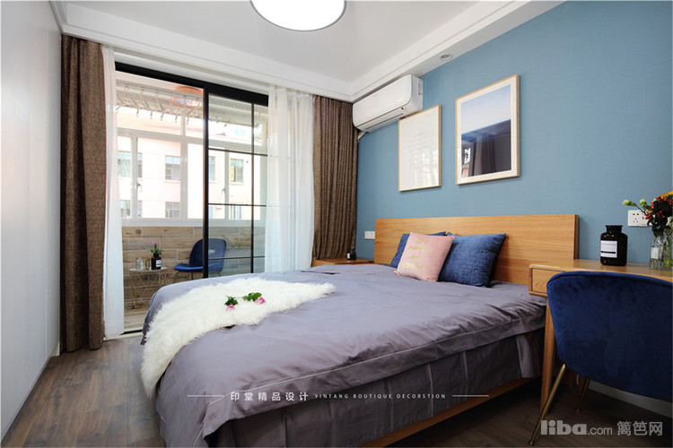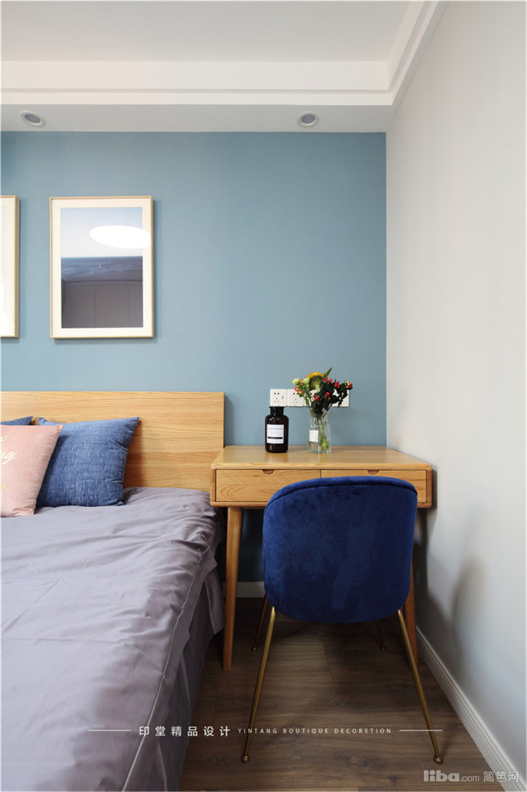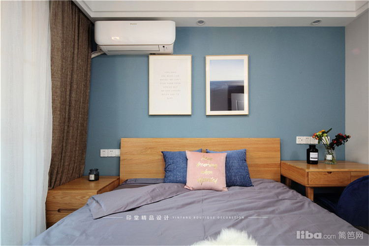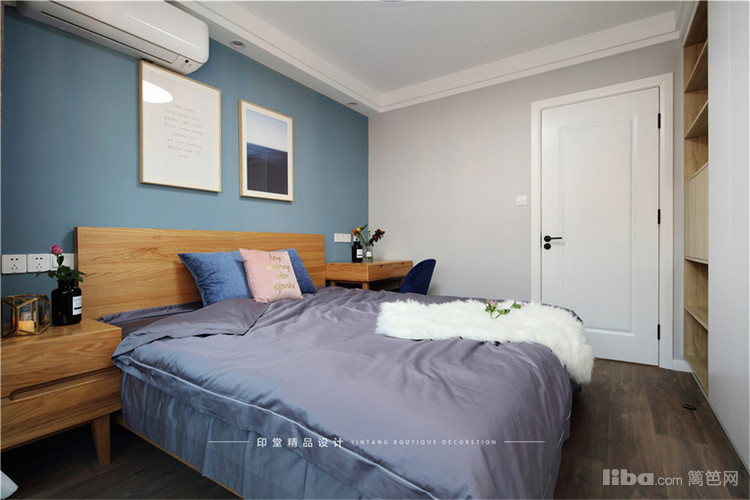湖蓝灰色的前面与木质床营造出静谧的氛围。