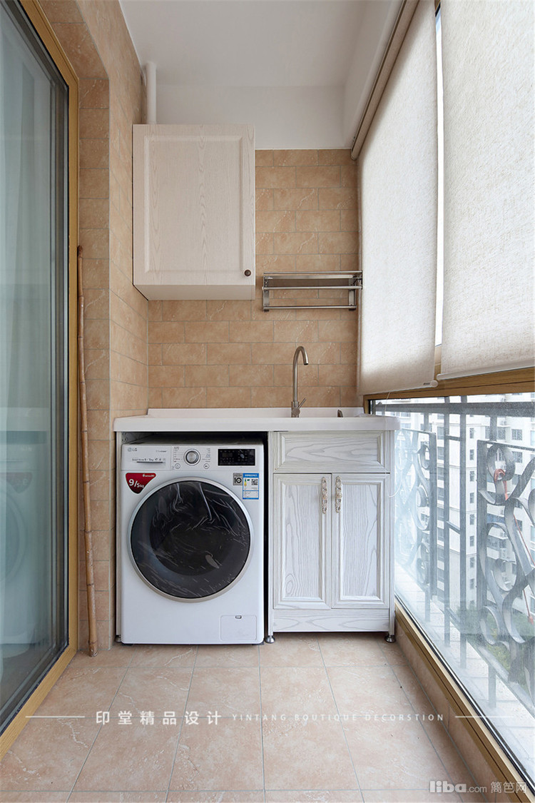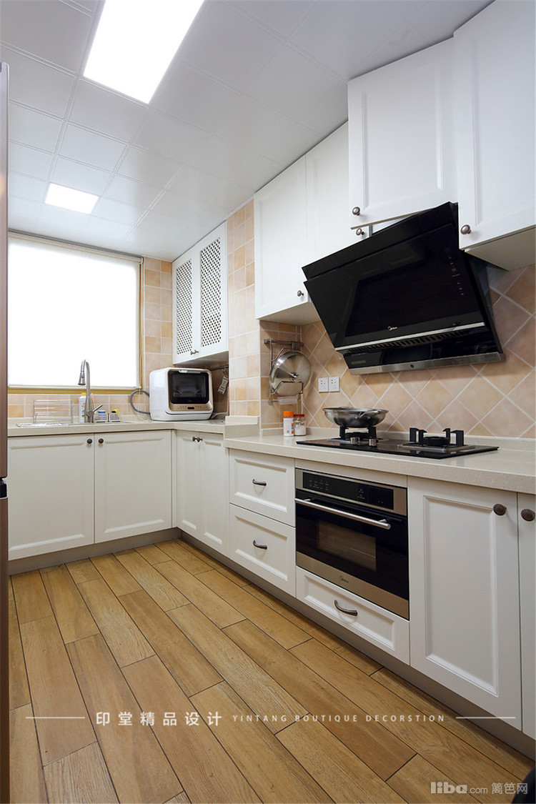 厨房白色的模压板搭配米色瓷砖,斜贴的造型使空间感更加活泼。