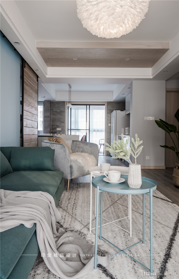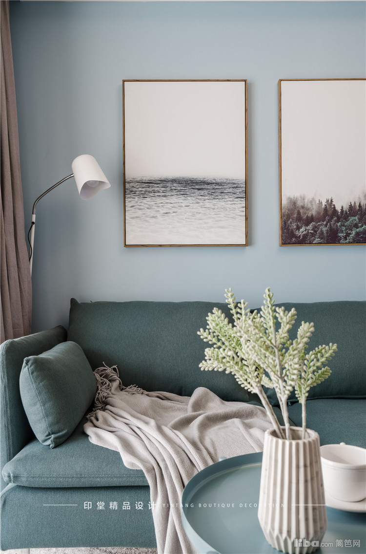 客厅区域大面积运用了灰蓝色系,营造出沉稳内敛的氛围。
