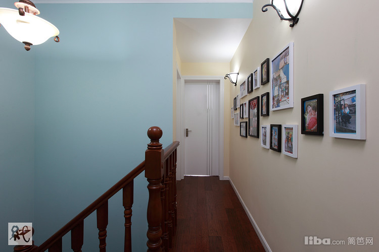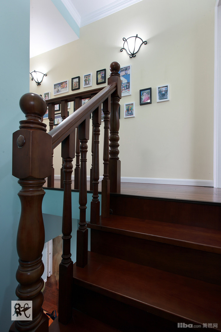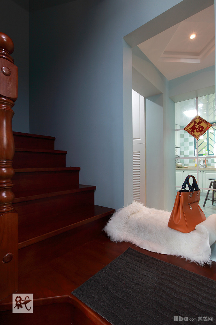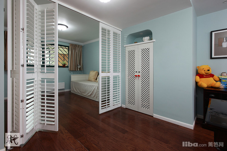 复式户型,顾虑到楼上楼下卫生间使用问题,一楼的卫生间特采取了干湿分离的方式。 以空间最大利用化的原则,干区部分特放在仅去儿童房的过道上。