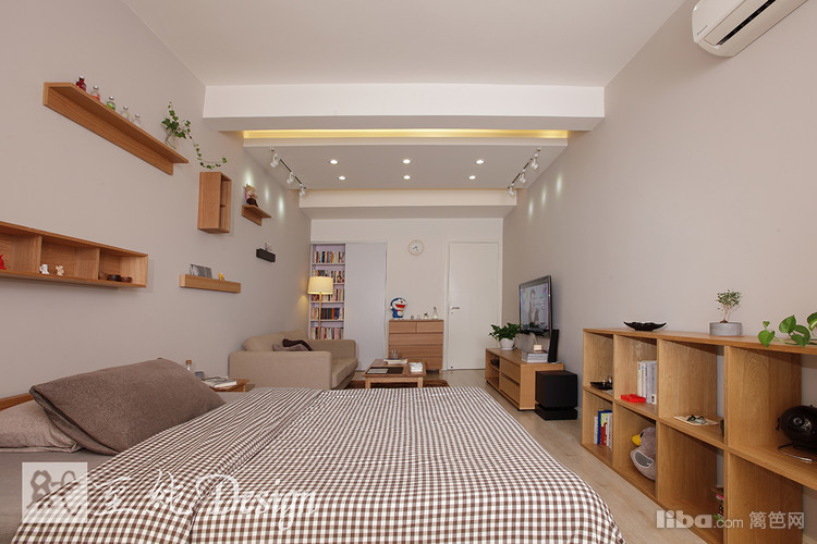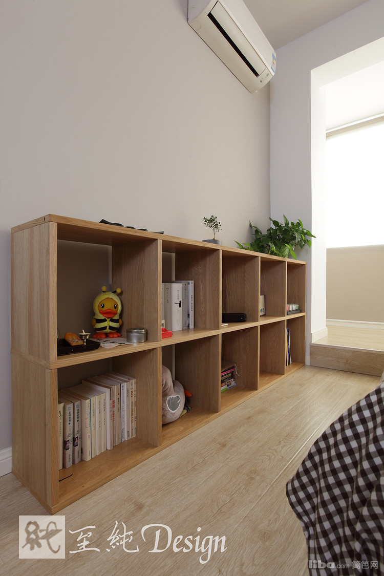 在衣帽间外侧做了个落地的书柜作为客厅装饰,这样既起到了美观、实用的作用,又在空间上隐藏了衣帽间;