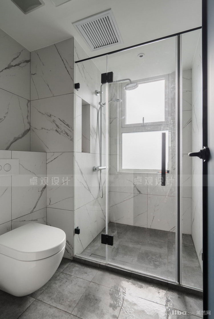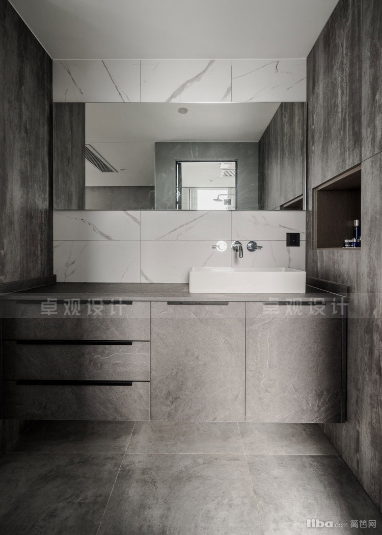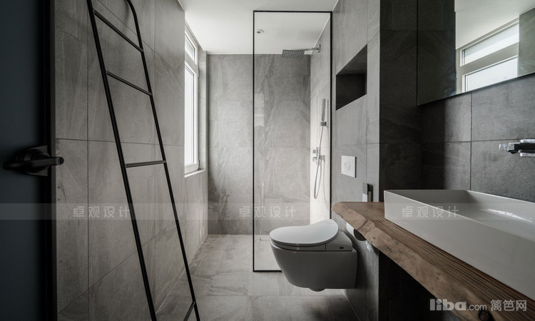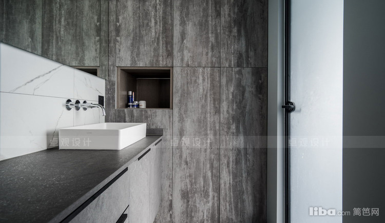 卫生间,黑白灰的色调,极简的卫浴装饰,再配以原木的点缀