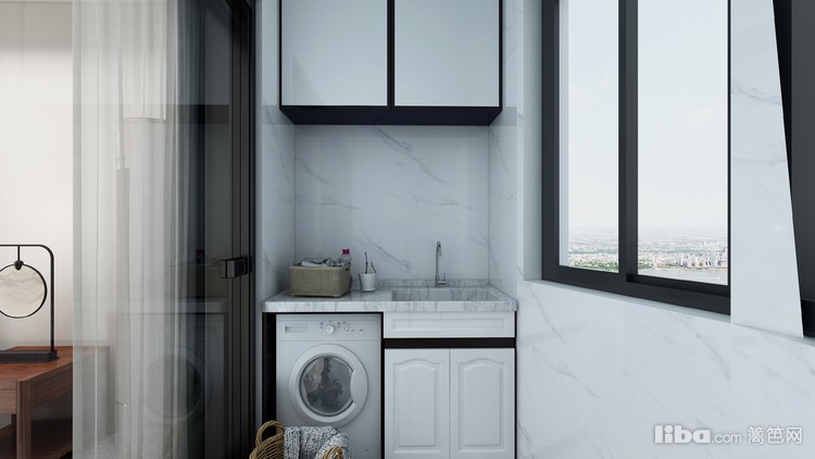 阳台一边设计成洗衣房,既能方便家居生活,又能满足晾晒衣物和洗衣机排水等条件。做了地柜和吊柜,是用来收纳的,洗衣机塞进地柜的空间里,整齐美观又实用。
