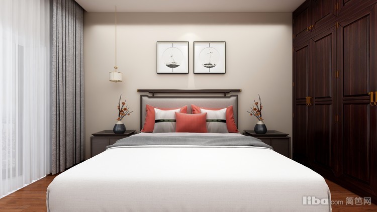 新中式的卧室色彩比传统的较丰富一点,橙色的靠枕使空间明朗中带着淡然悠远、沉稳儒雅;