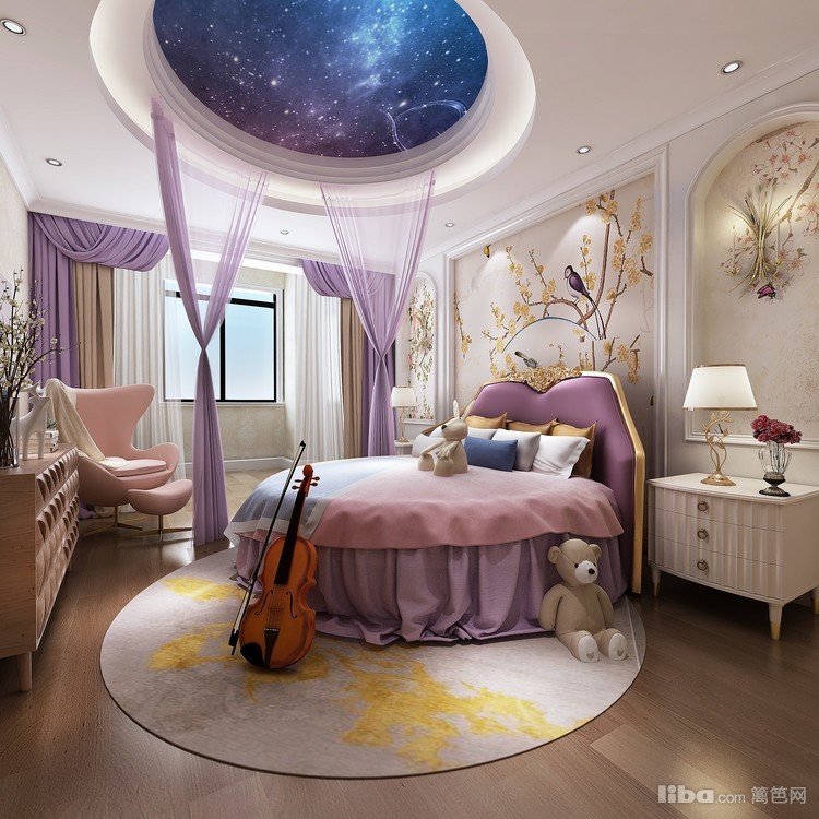 女儿房的顶面做了嵌入式的设计,配上星空图案,仿佛置身于星空宇宙中