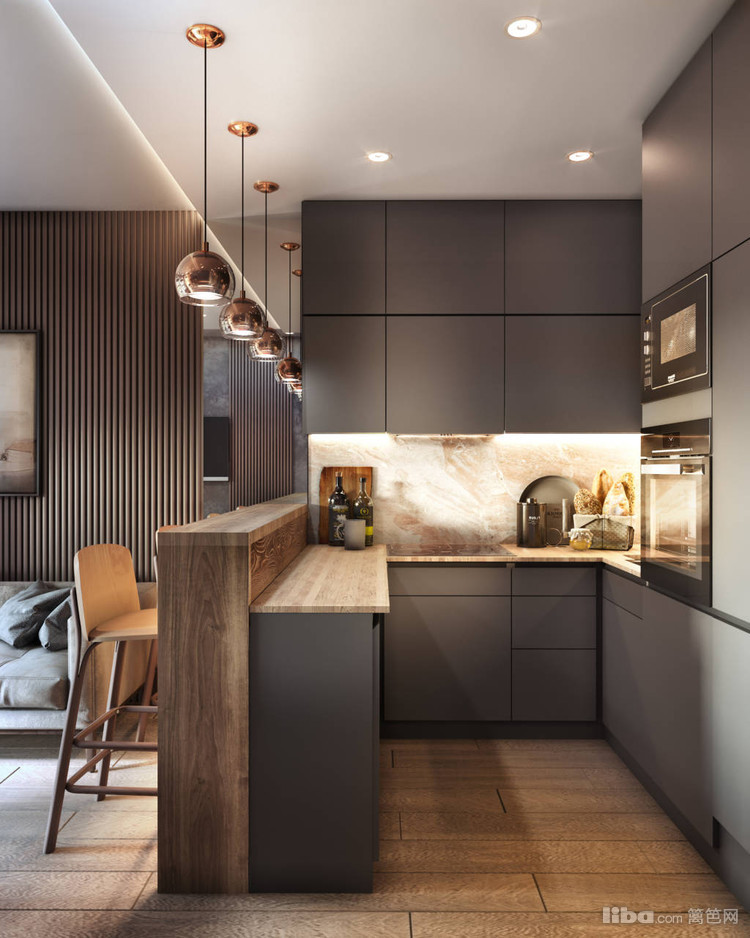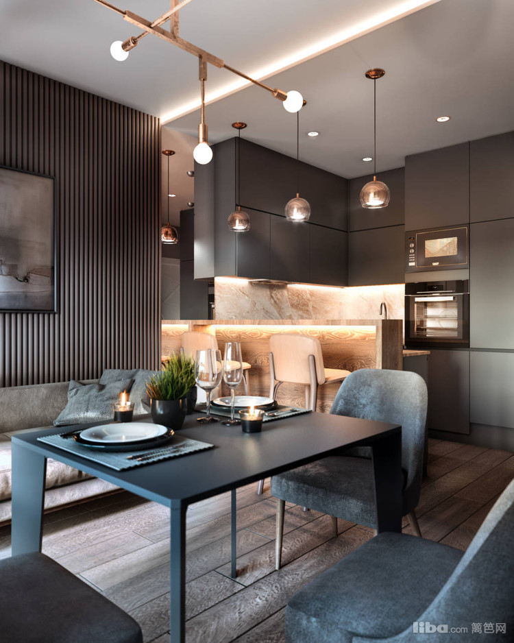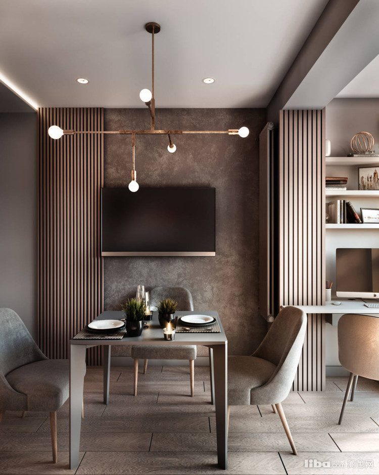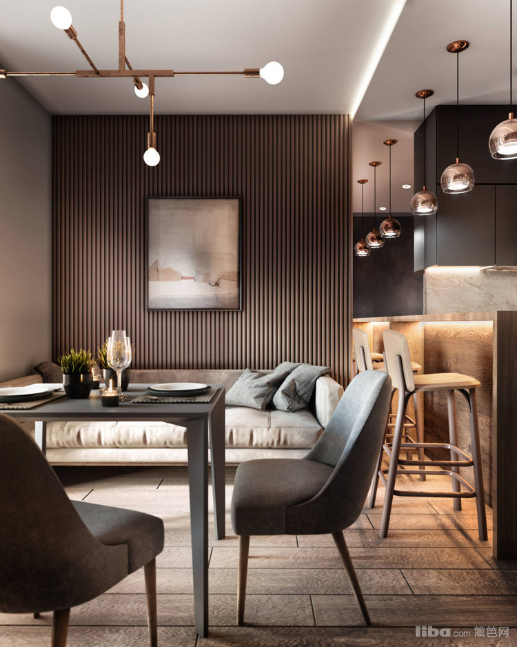 开放式的厨房是时下年青一代生活方式的潮流,厨房客餐厅并存一个空间,使用对比色原则,采用深咖色打造纹理特色的重点墙,辅以浅灰色和浅棕色家具来稀释空间重色。