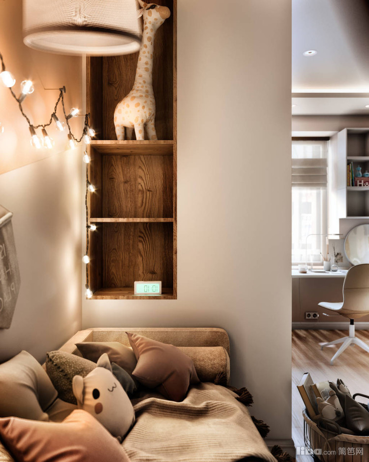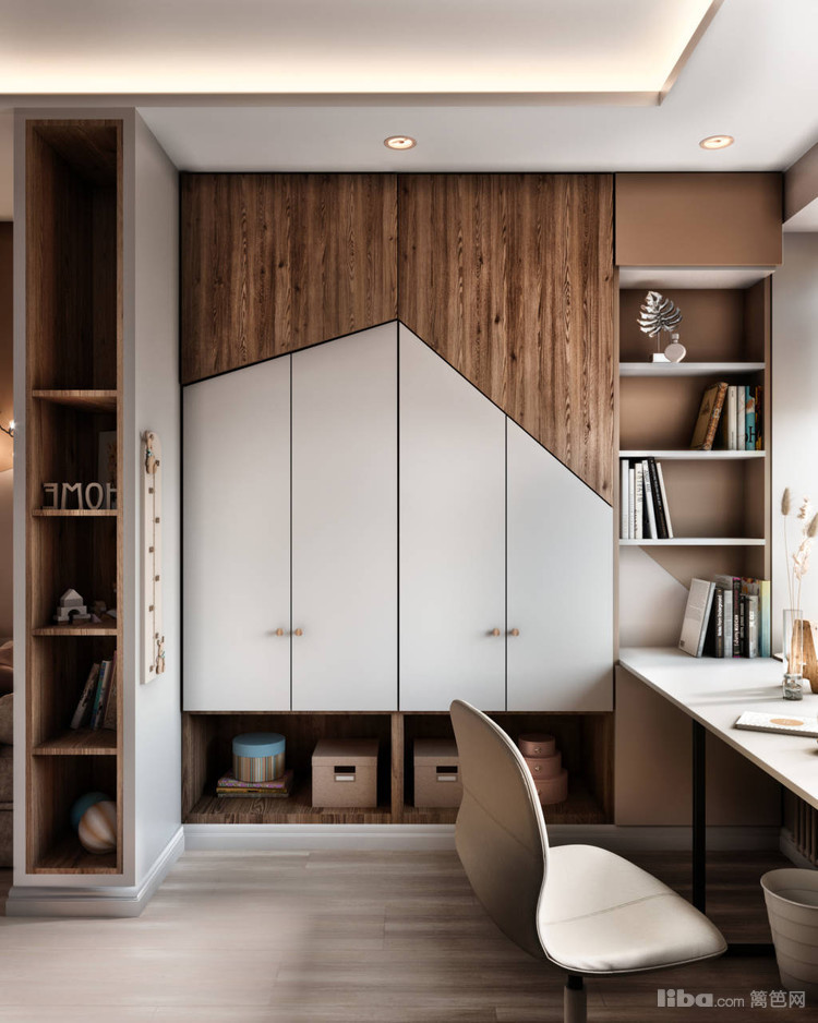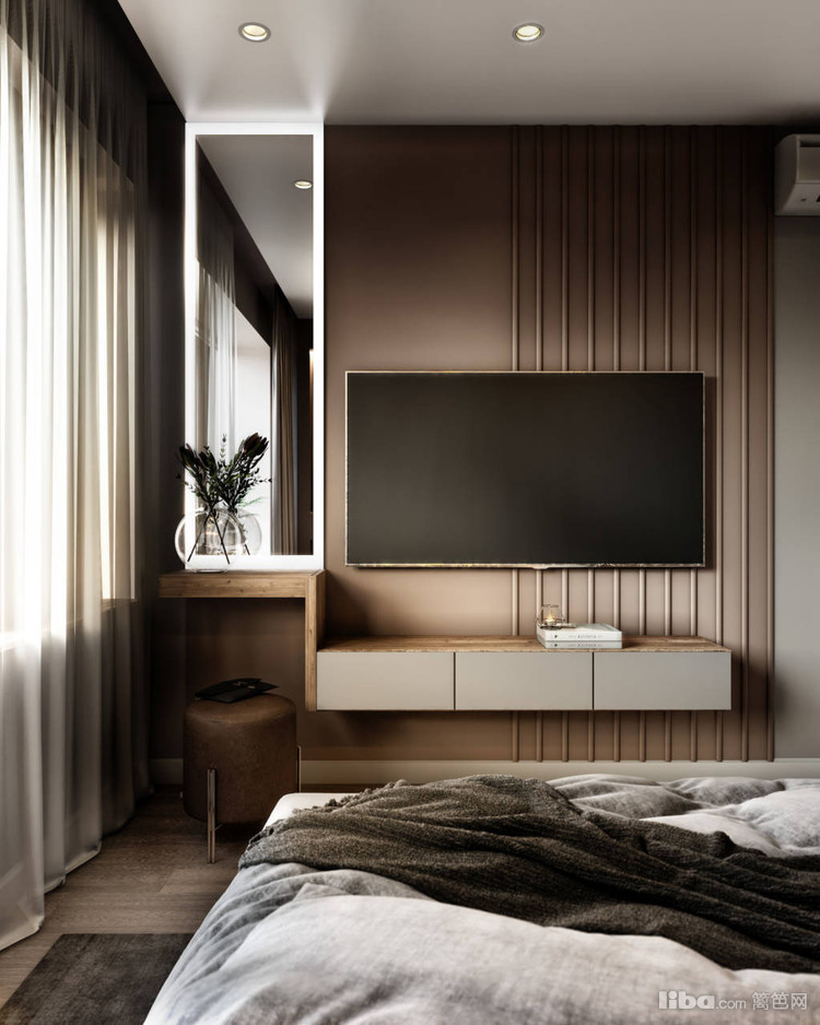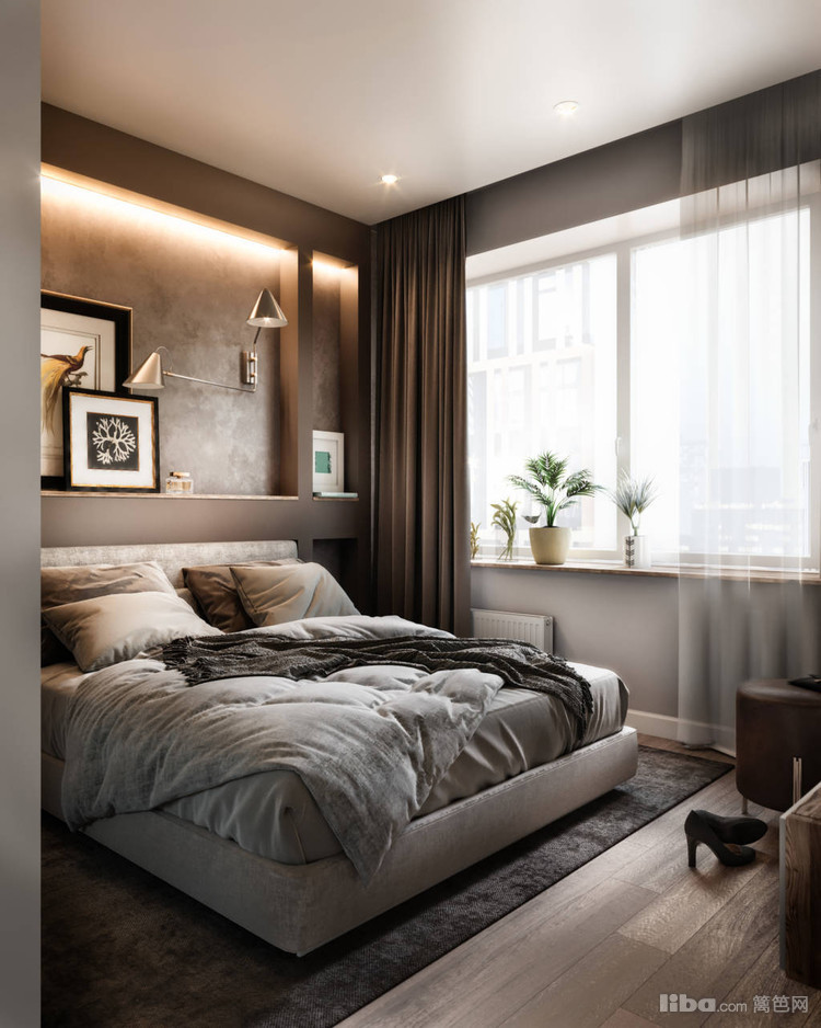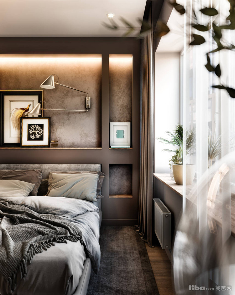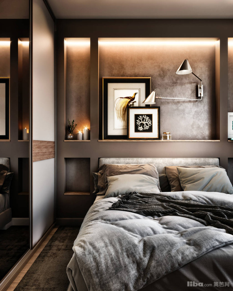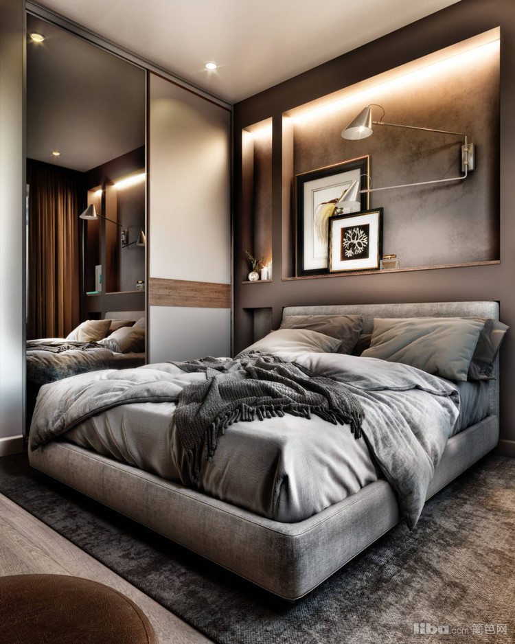 灰色与棕色的相结合,会跟整各空间带来舒适放松的氛围感,哑光质感辅以中性色调,卧室背景墙的特殊造型,满足正常床头柜需求的同时,更富有时尚设计感