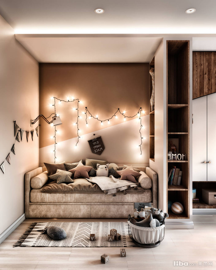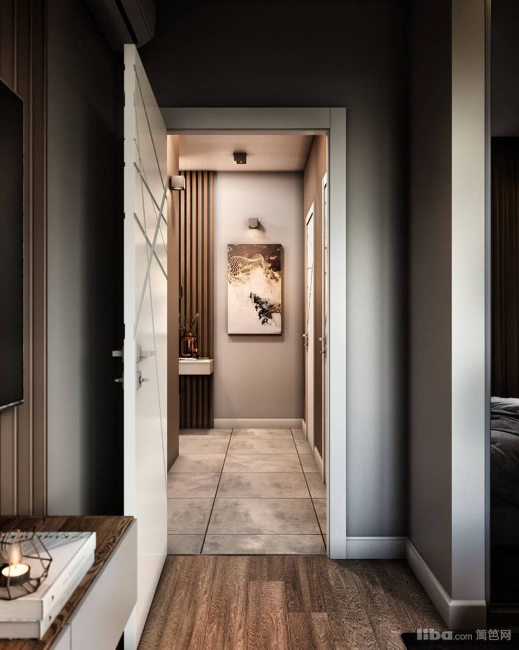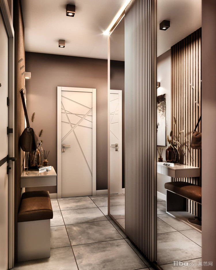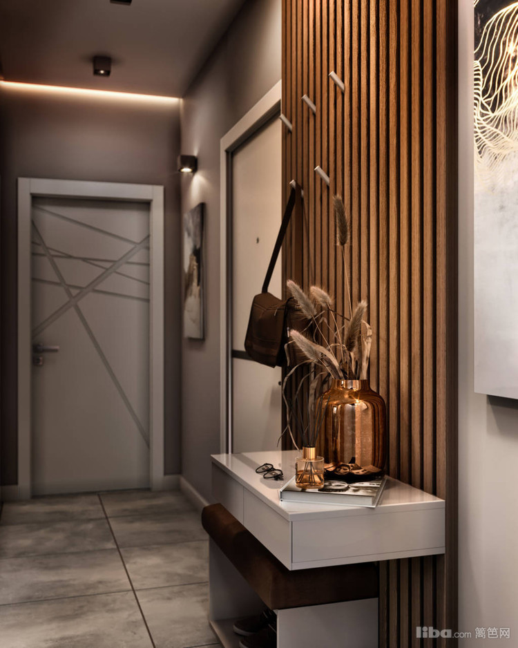 用浅棕映入视觉过度暗色系的空间,提升空间进入的舒适感