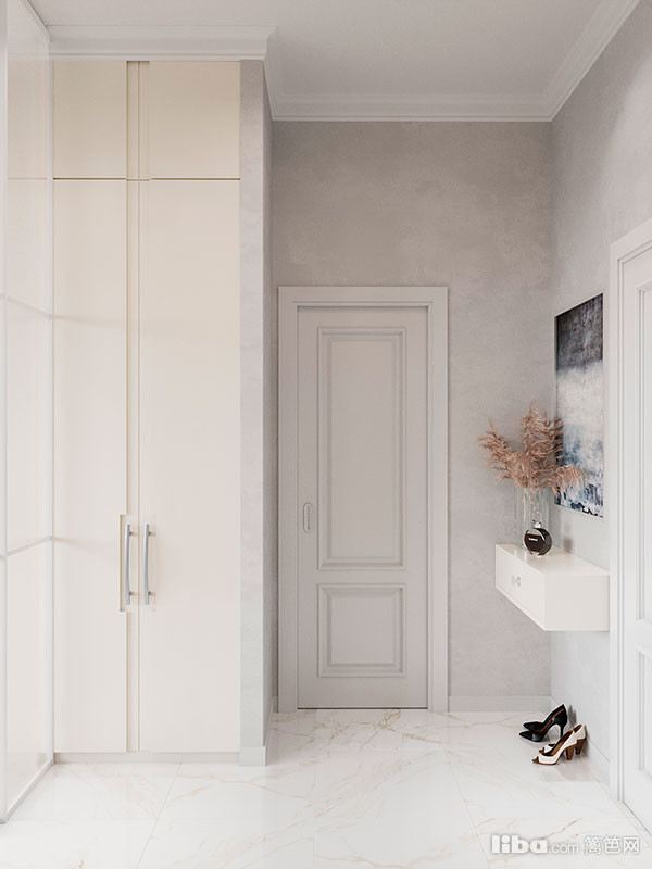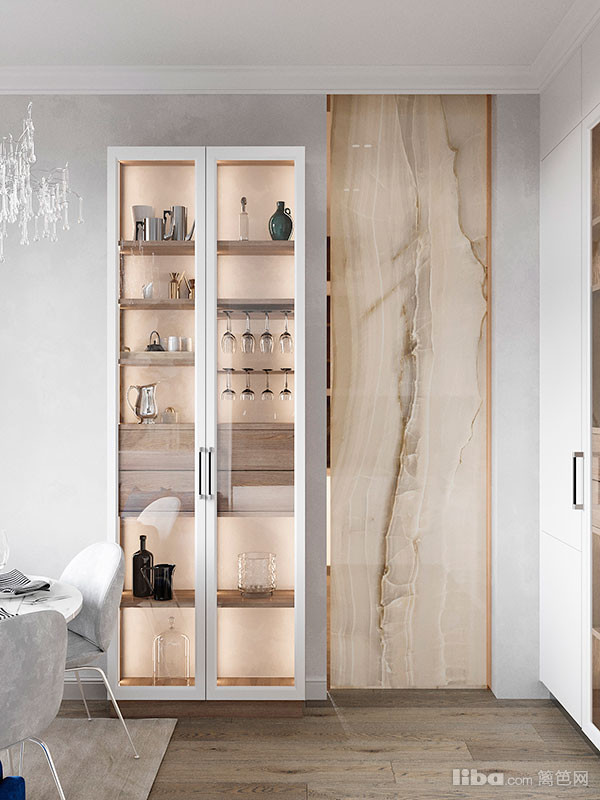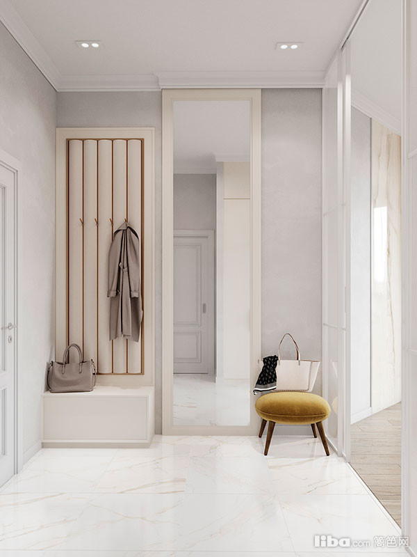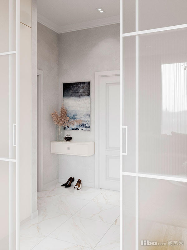 将进门玄关处单独隔开以给到客厅更多地隐私性,运用透光的哑光玻璃面板保证入口区域的采光同时使得空间不会因为区域分隔而显得狭小。