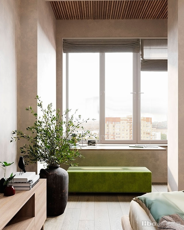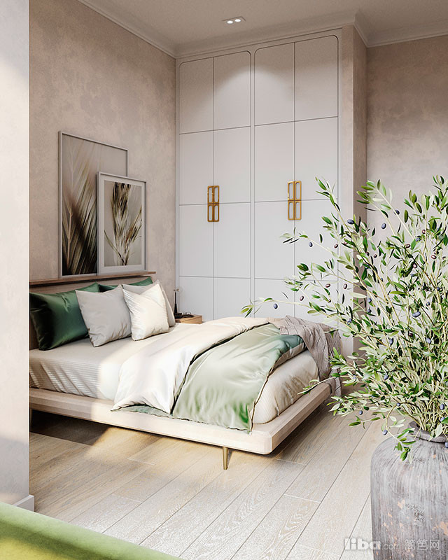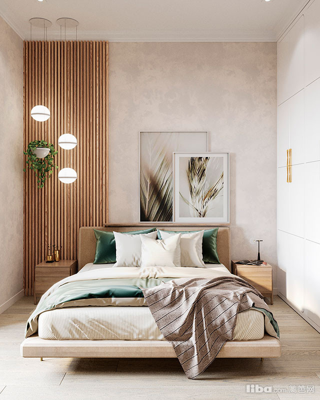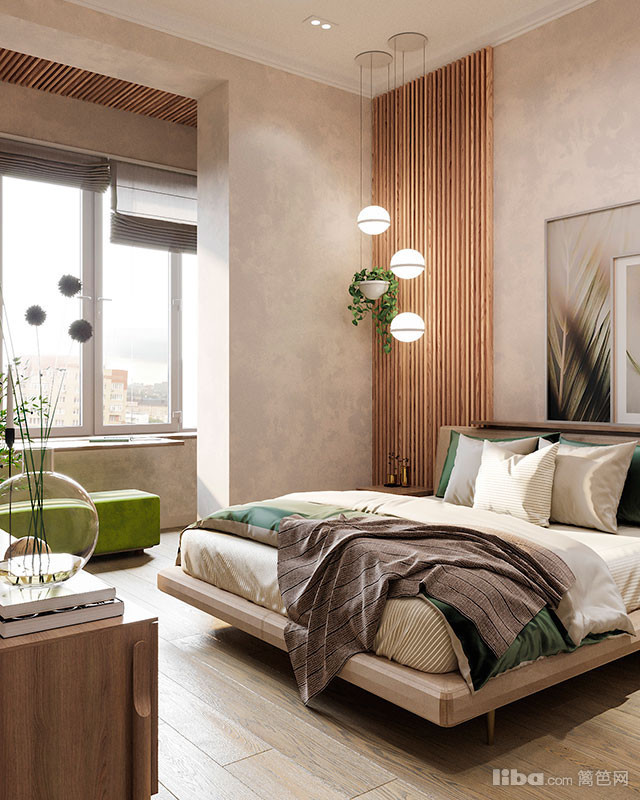 卧室选用了素雅的米色与灰色作为空间的调色板,以深绿色为重点,床后的木质墙板与吊灯一起营造出有趣的视觉效果。