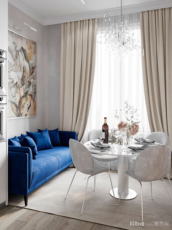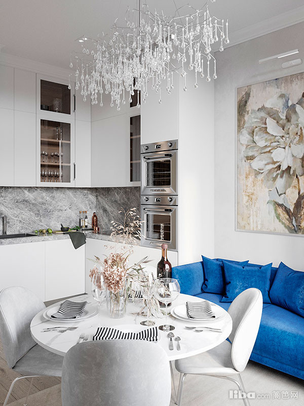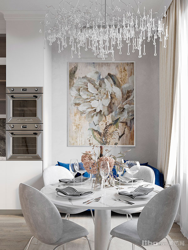 厨房是整个屋子里最舒适的空间之一。墙壁的珍珠灰色让人联想到融雪,华丽的水晶吊灯,巨大的花朵绘画营造出浪漫的氛围。