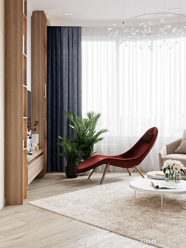 在客厅使用宝蓝色和酒红色作为强调色。与木质纹理一起,它们为空间带来温暖和舒适感