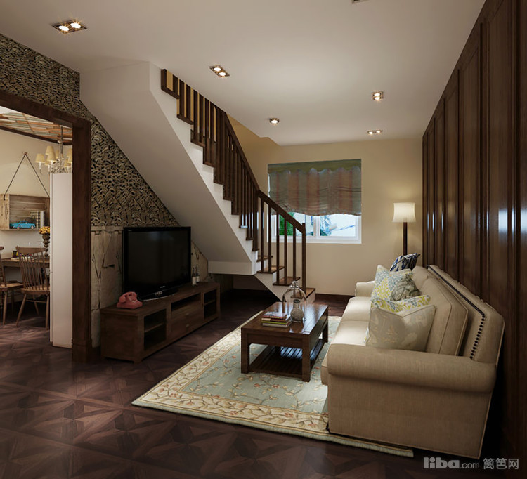 客厅采用樱桃木饰面板做墙面,保留老房的味道。电视墙做在楼梯的下面,充分利用空间。